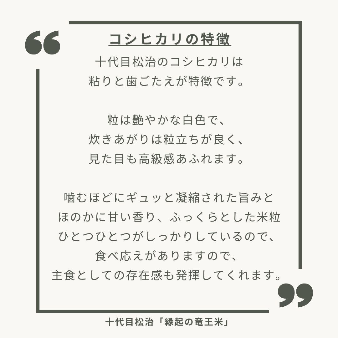 十代目松治のコシヒカリは粘りと歯ごたえが特徴で、噛むほどにギュッと凝縮された旨みが感じられます。
