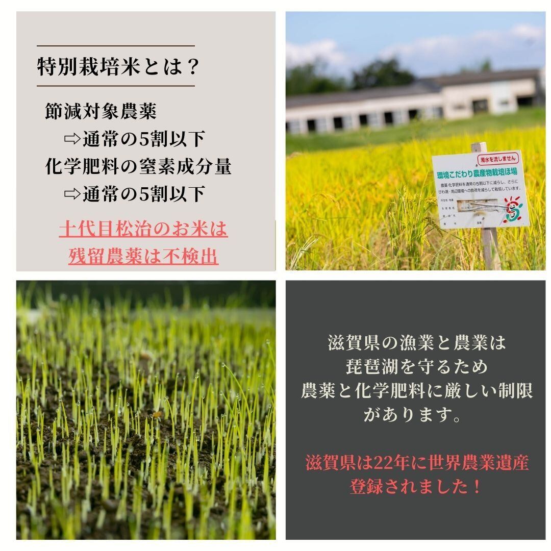 農林水産省の「特別栽培農産物に係る表示ガイドライン」に基づき、滋賀県の厳しい安全基準をクリアした「環境こだわり米」として認証されています。
